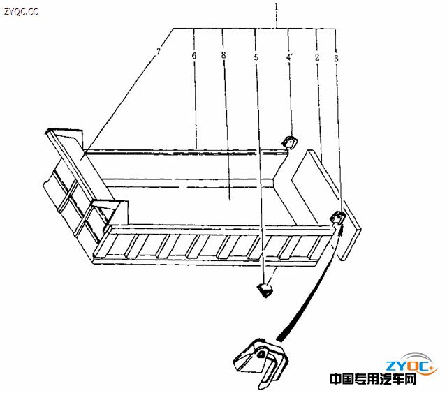1-車廂總成;2-后欄板;3、4-鉸鏈座;5-車廂鉸支座;