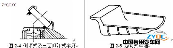 側傾式及三面傾卸式車廂欄板與底板為直角,如圖2-4所示。其欄板開啟、關閉的鉸接軸為上置式,開啟時,欄板呈自由懸垂狀,多用于有側傾要求的中型自卸汽車。